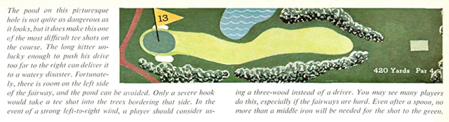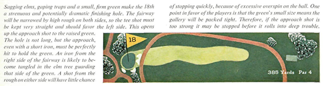 He went on to call the 12th hole a par 4½ due to its length and the 13th one of the toughest driving holes on the course. The par-5 14th hole is identified by Nicklaus as “the climax of the six critical holes, as well as the last chance for the long hitter to wrest some advantage from his length” as long hitters will carry a large mound offering a chance to go for the green in two, while short hitters will land into the hill and not get any run.