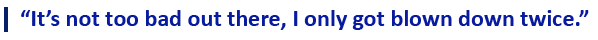“It’s not too bad out there,” Lema told reporters at lunch, “I only got blown down twice.”