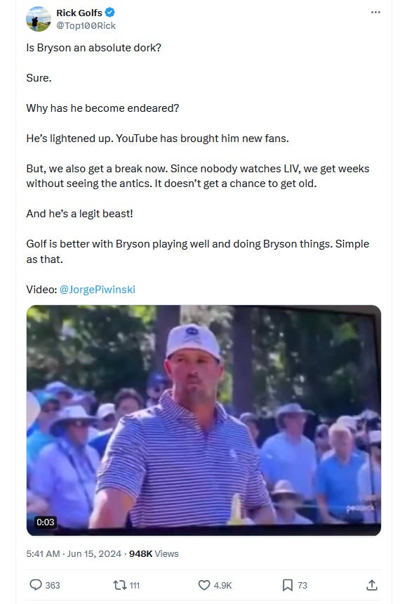 I’m quite impressed with how Bryson DeChambeau has transformed himself into a fan favorite. He sure delivered for the fans after he won, spending a lot of time on the grounds at Pinehurst signing autographs and engaging with fans. His round was quite entertaining, and he is proving, as McIlroy said in his post-mortem statement on X, that he is just what the game needs right now.