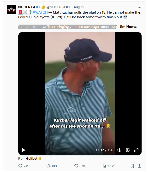 This week we ask you, what the heck was going on with Matt Kuchar at the Wyndham Championship when he decided not to finish the 18th hole because of darkness? His partners elected to finish and Kuchar was the only player to return on Monday to finish their round. This prompted CBS’s Jim Nantz to say, "I don't expect we'll be bringing you that coverage tomorrow.”